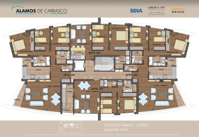 - Pavimentos en living comedor, circulaciones interiores al apartamento y dormitorios de la línea “Solidwood” de Kalpakian; hall de acceso y palier de piso de porcelanato gris; terrazas porcelanato gris; pisos estacionamiento de hormigón llaneado y escaleras de hormigón llaneado y pintado.