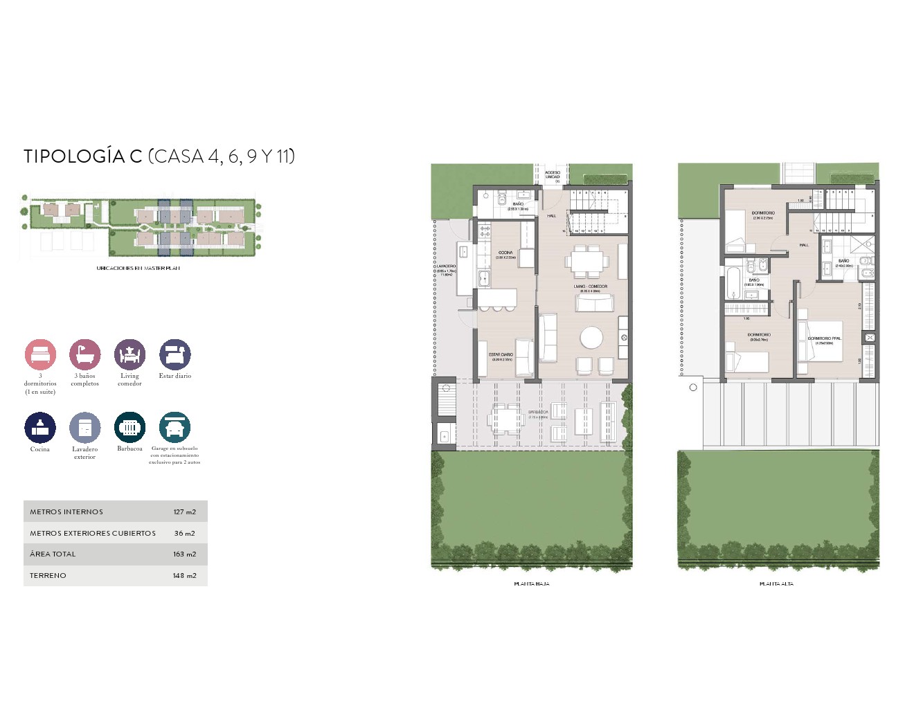 PAISAJISMO Y JARDINES: Proyecto paisajístico diseñado por Identidad Paisajismo con el objetivo de realzar la gran vegetación existente componerlo con nuevas especies que embellezcan la estética del proyecto y funcionales a las divisorias entre unidades. Se proveerá el césped donde corresponda. Caminería compuesta por baldosones de hormigón.