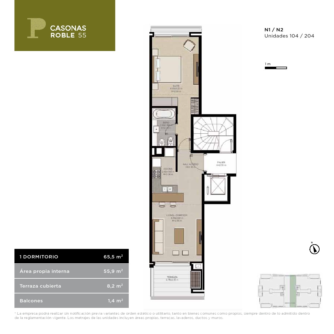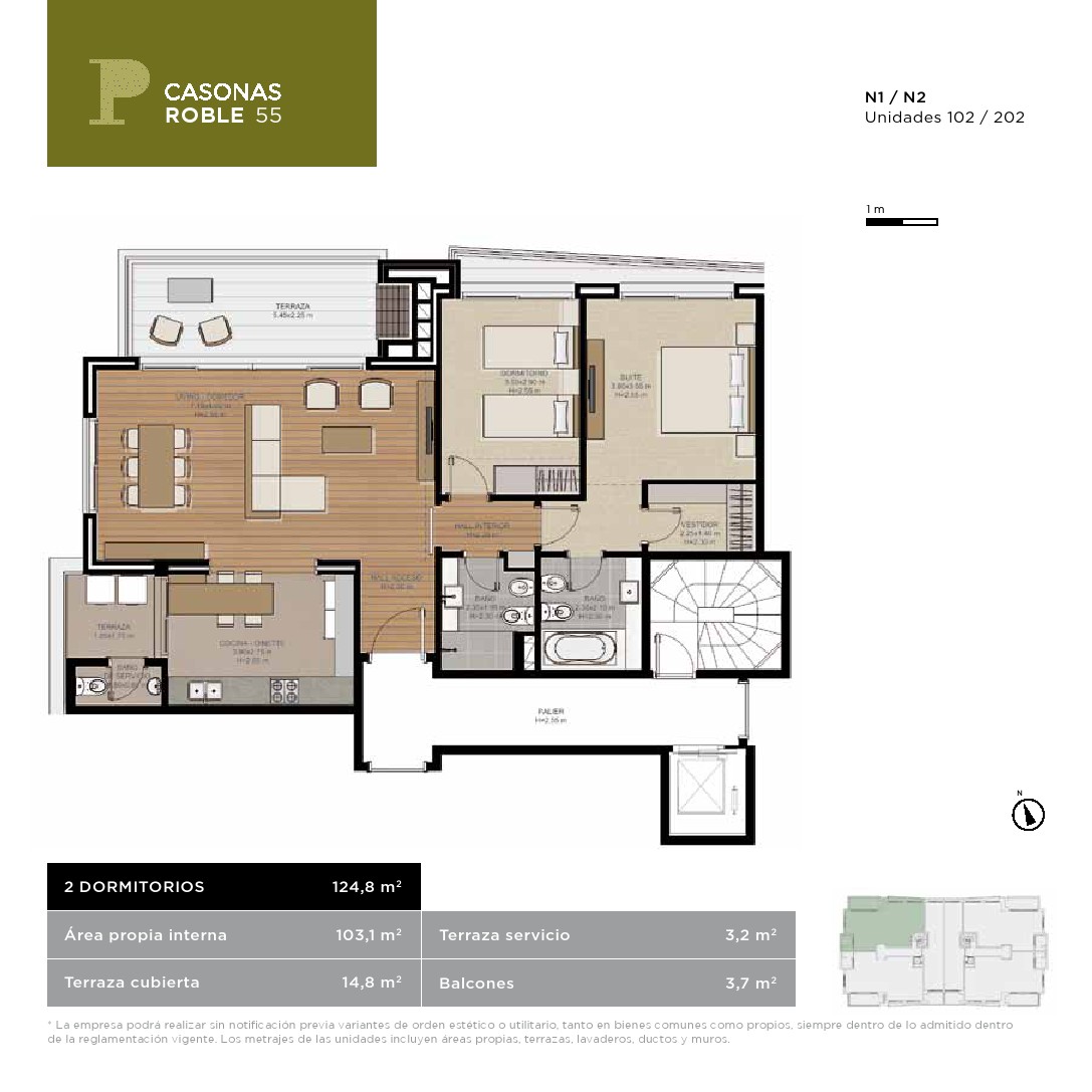 - Pisos de madera natural de ingeniería (porcelanato en aptos. de 1 dormitorio) y madera flotante de PVC o vinílico pegado en dormitorios.