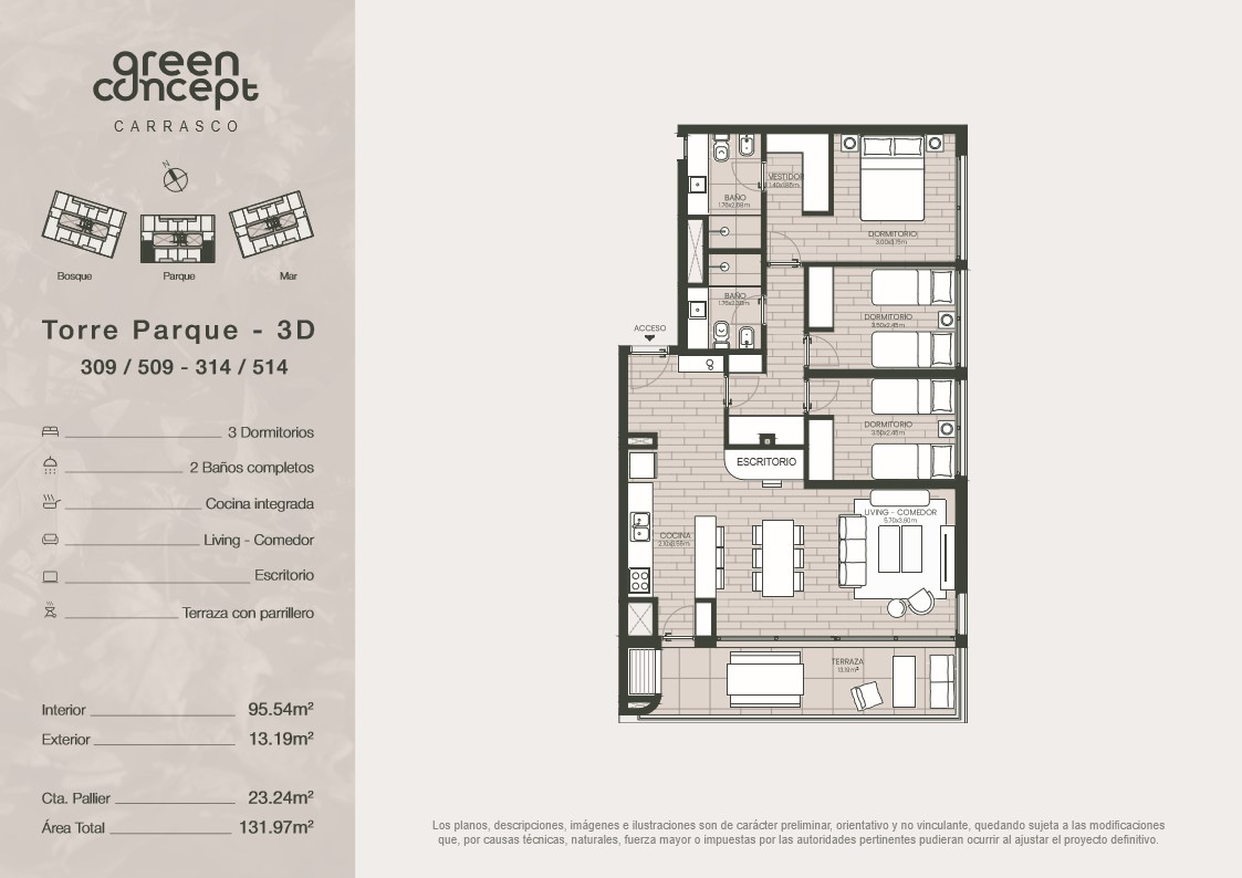 Lindante con un parque lineal y rodeado de un entorno cuidado se ubica Green Concept: Un desarrollo de 3 bloques de edificios bajos con entorno y centro verde. Se trata de una arquitectura contemporánea diseñada por RMA Arquitectos, que integra el entorno de manera respetuosa, incorporándolo en su interior. Unidades de 1, 2 y 3 dormitorios, unidos por un parque diseñado con todos los detalles, que lo convertirá en el lugar donde no veas la hora de volver todos los días. Apartamentos con vistas al parque, al bosque o al mar logrando una conexión única con el entorno, combinando un diseño moderno, con detalles de calidad y la naturaleza que lo rodea.