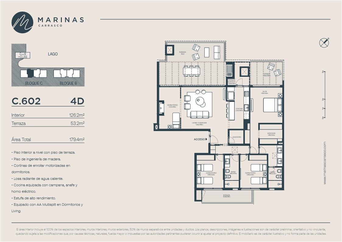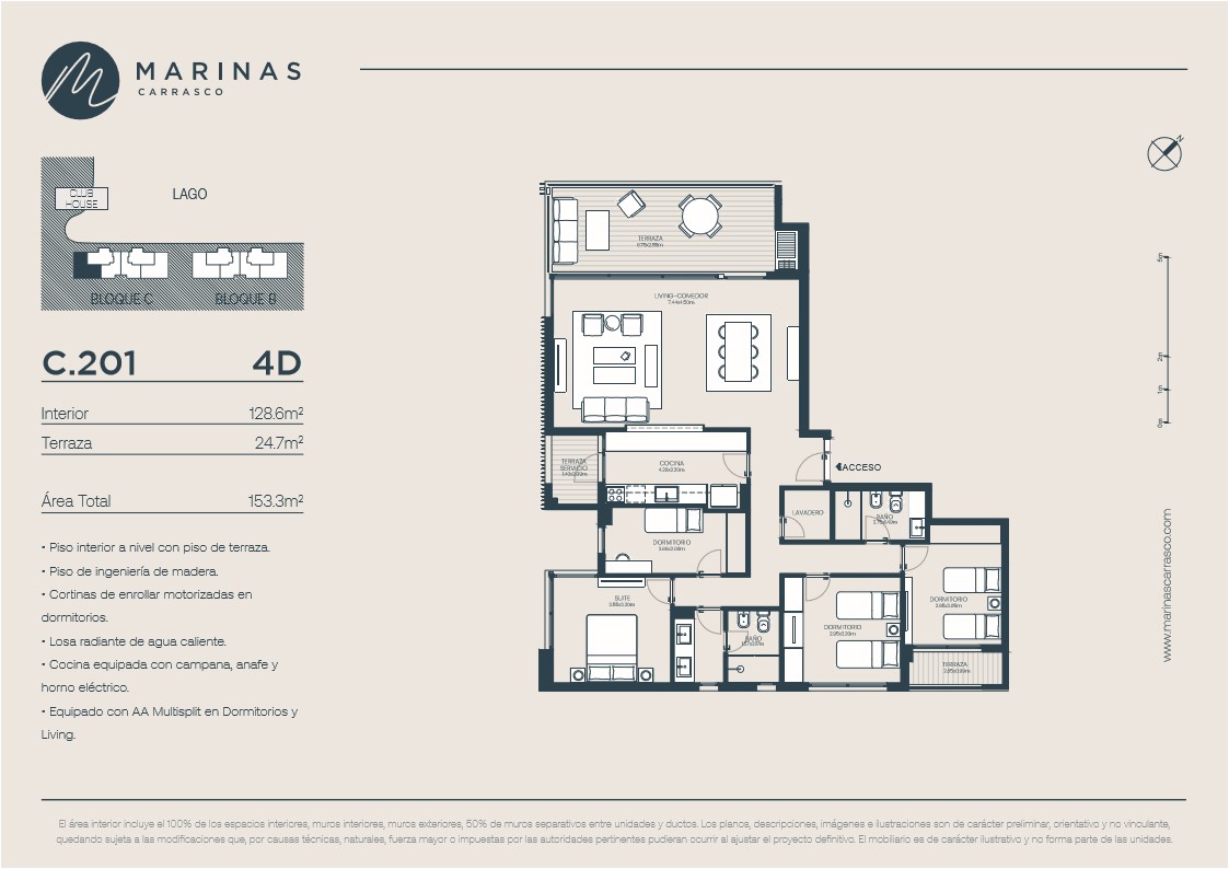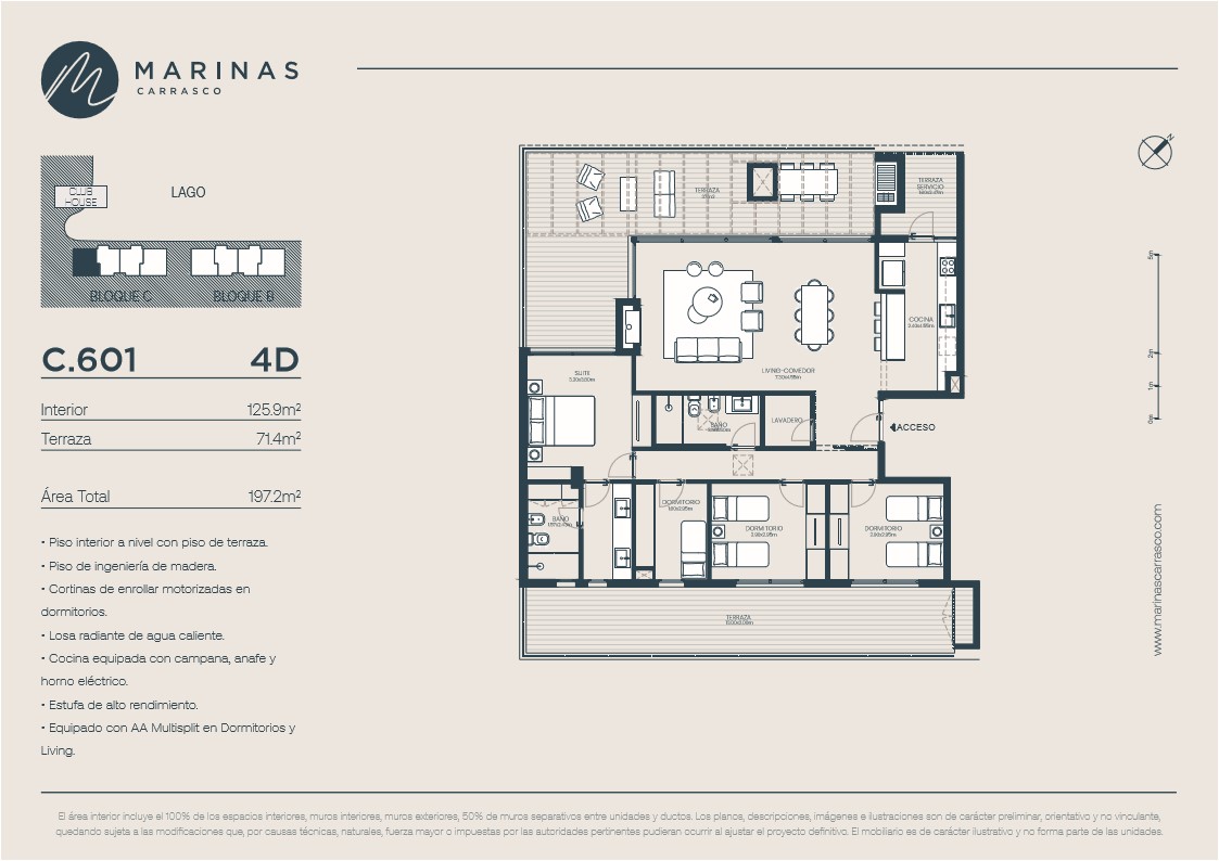 Leer más >Con orientación noroeste, todos los apartamentos cuentan con terrazas, parrillas y vista al lago, además de un diseño de alta calidad del Estudio Gómez Platero. Marinas Carrasco tendrá su ingreso principal conectado a dos accesos, uno que será por la calle lateral a Avenida de las Américas (al norte de Avenida Italia), y otro desde el corazón de Parque Miramar, lo que hará muy práctico tanto el ingreso como la salida al barrio.